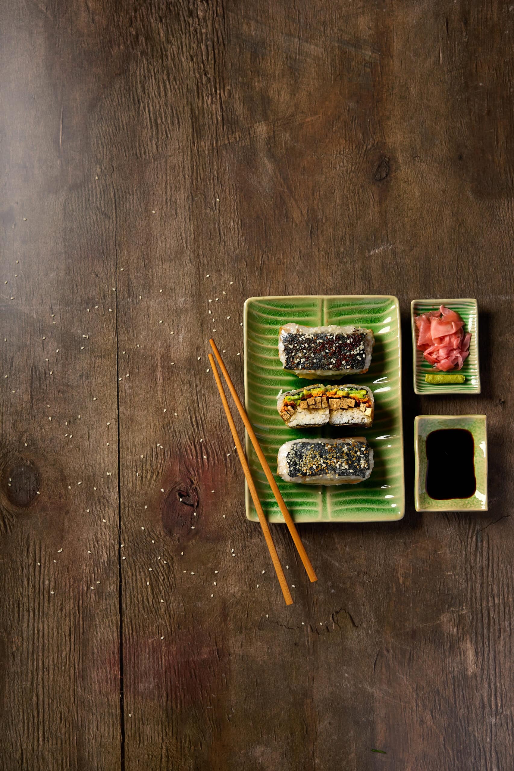Na środek połóż wodorost nori, liść sałaty, dodaj cienką warstwę ryżu, tofu, ogórka, marchewkę, awokado i nasiona sezamu.